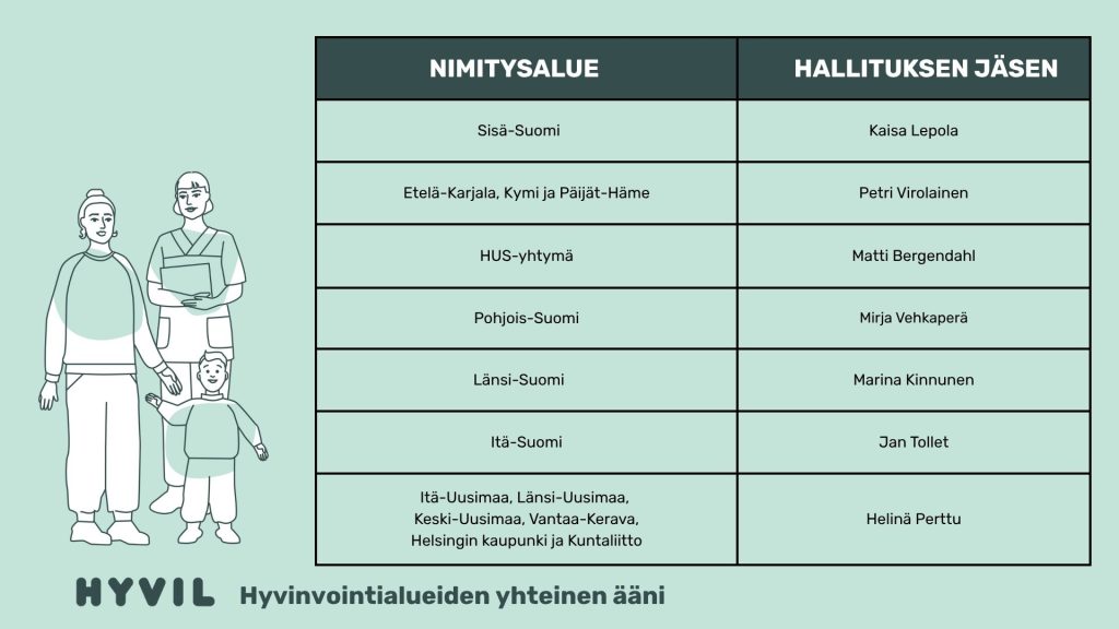 Hallituksen puheenjohtajana jatkaa aluehallituksen puheenjohtaja Helinä Perttu Keski-Uudenmaan hyvinvointialueelta ja jäsenenä jatkaa toimitusjohtaja Matti Bergendahl HUS-Yhtymästä. Uusina jäseninä aloittivat aluehallituksen puheenjohtaja Kaisa Lepola Kanta-Hämeen hyvinvointialueelta, hyvinvointialuejohtaja Petri Virolainen Päijät-Hämeen hyvinvointialueelta, aluehallituksen puheenjohtaja Mirja Vehkäperä Pohjois-Pohjanmaan hyvinvointialueelta, hyvinvointialuejohtaja Marina Kinnunen Pohjanmaan hyvinvointialueelta sekä hyvinvointialuejohtaja Jan Tollet Keski-Suomen hyvinvointialueelta.